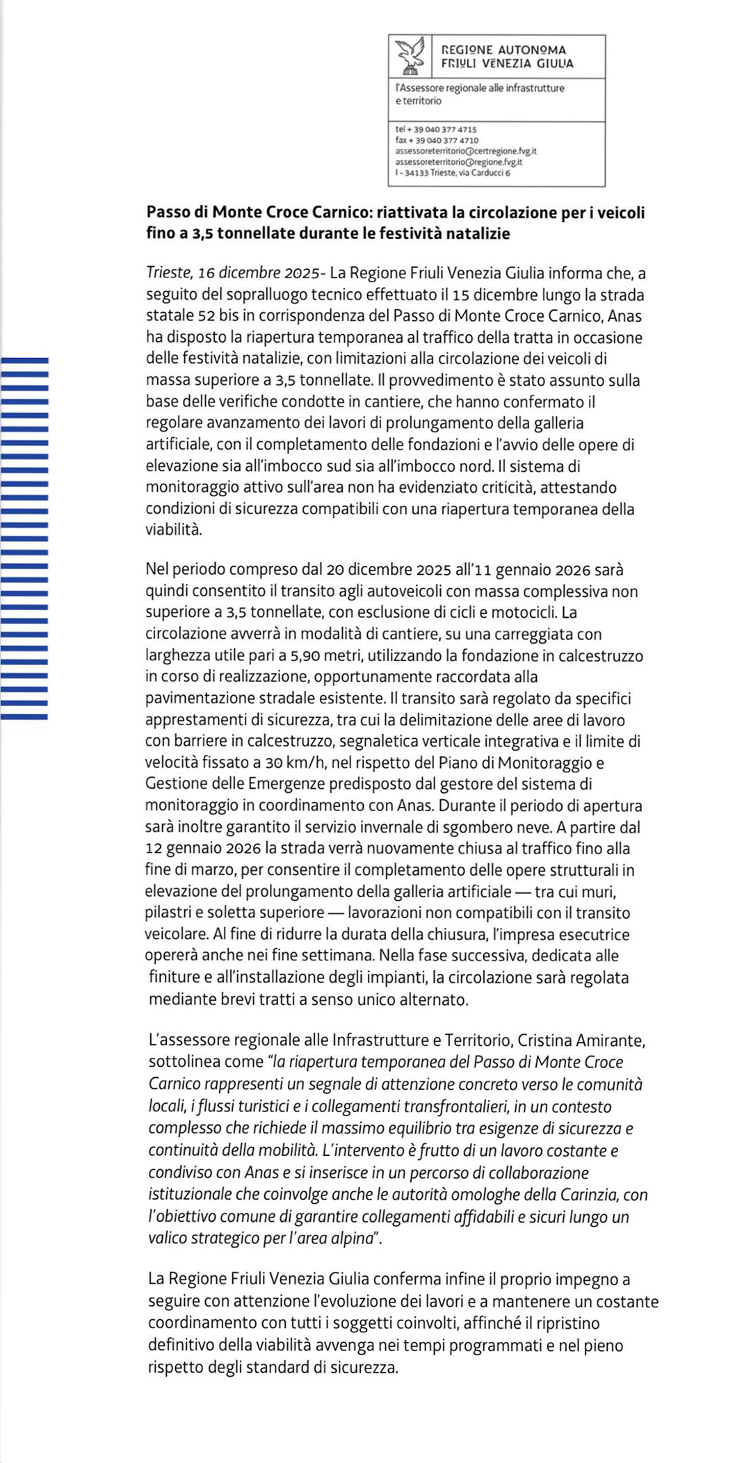 Die alternative Trasse und der Scheiteltunnel werden geprüft. Der Scheiteltunnel wird als eine sichere und technisch machbare Lösung angesehen, die allerdings schwer finanzierbar ist. Amirante bekräftigte, dass die Region Friaul-Julisch Venetien, wie in dem Treffen mit den Wirtschaftsverbänden und Bürgermeistern der Region bekräftigt, die Lösung mit dem Scheiteltunnel befürwortet, da dieser nachhaltiger und sicherer ist und eine Öffnung an 365 Tagen im Jahr rund um die Uhr ermöglichen würde.